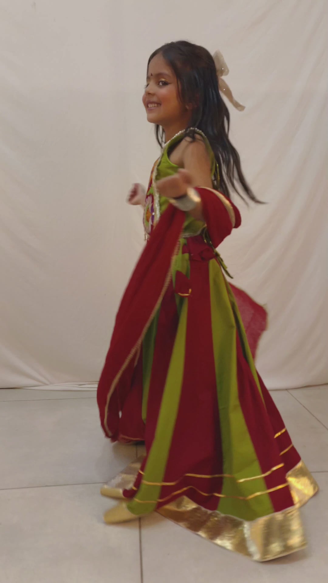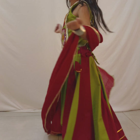 A vibrant and festive ensemble, this green and red lehenga choli set is crafted to make your little girl shine during celebrations. The choli features colorful traditional embroidery work detailing, enhanced with delicate pearl lace and tassels along the hemline. The flared red and green skirt adds charm with its golden zari border, while the contrasting red dupatta completes this beautiful ethnic outfit.