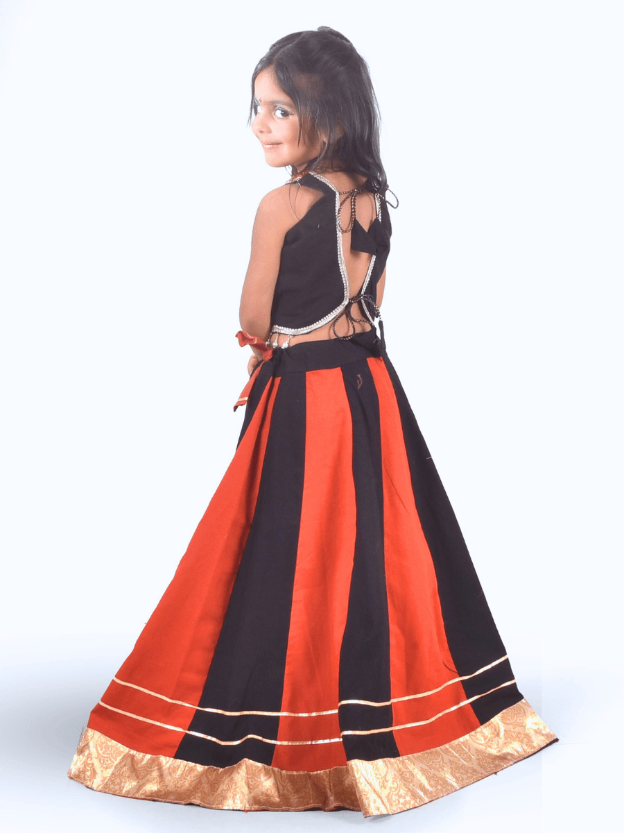 A vibrant mix of tradition and sparkle, this orange and black lehenga choli set is designed to make your little girl dazzle at every festive occasion. The choli features intricate sequin embroidery with elegant lace detailing, paired with a flared black skirt accentuated by a golden border. The soft orange dupatta adds a graceful finish, making it a stunning festive ensemble.