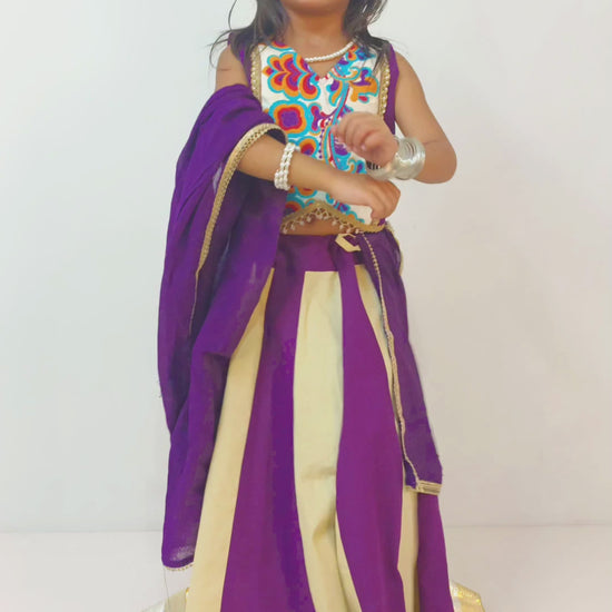 A vibrant and elegant ensemble, this purple and cream lehenga choli set is designed to make festive dressing joyful and effortless. The choli features a stunning multicolor embroidered yoke with intricate floral patterns and delicate lace detailing along the edges. The flared cream and purple panelled lehenga adds a graceful touch with its golden zari border, while the matching purple dupatta enhances the traditional appeal with a shimmer finish.