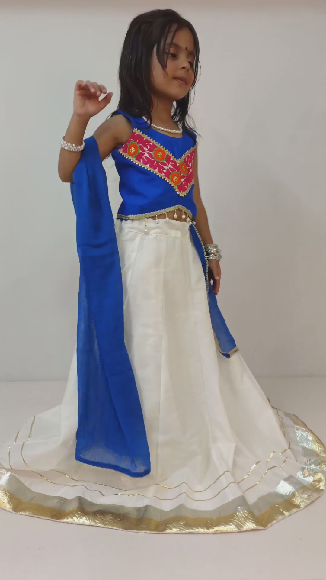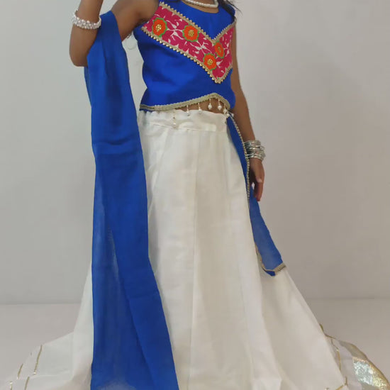 A vibrant and elegant ensemble, this royal blue and white lehenga choli set is designed to make your little one shine on every festive occasion. The royal blue choli features a striking embroidered ‘V’ panel in bright red and yellow floral motifs, accented with delicate golden lace and pearl trimming. The flowing white lehenga adds a graceful contrast, finished with a shimmering gold border. The matching blue dupatta ties the whole look together beautifully.